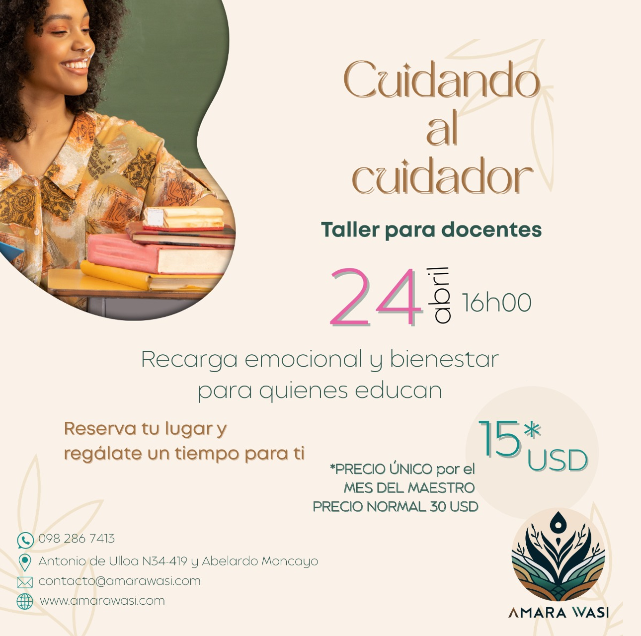 Bienvenidos a «Cuidando al cuidador», un espacio creado especialmente para ti, docente. Reconocemos tu inmenso compromiso y dedicación al dar lo mejor de ti para proteger y guiar a tus alumnos. Este taller es nuestro homenaje a tu labor, ofreciéndote herramientas y momentos de autocuidado para fortalecer tu bienestar emocional y físico. ¡Es hora de que te priorices como mereces!